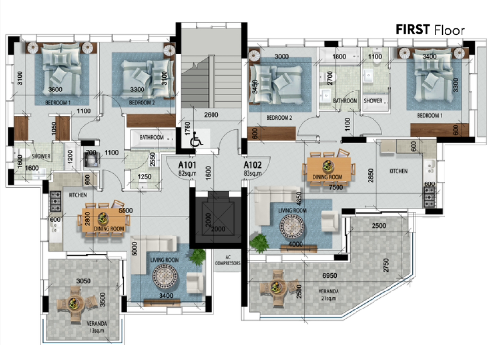 The apartment measures 104sqm total area, 83sqm internal area with a covered balcony of 21sqm.