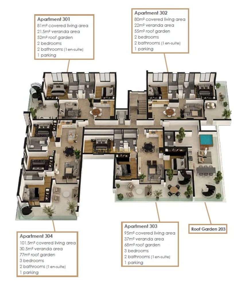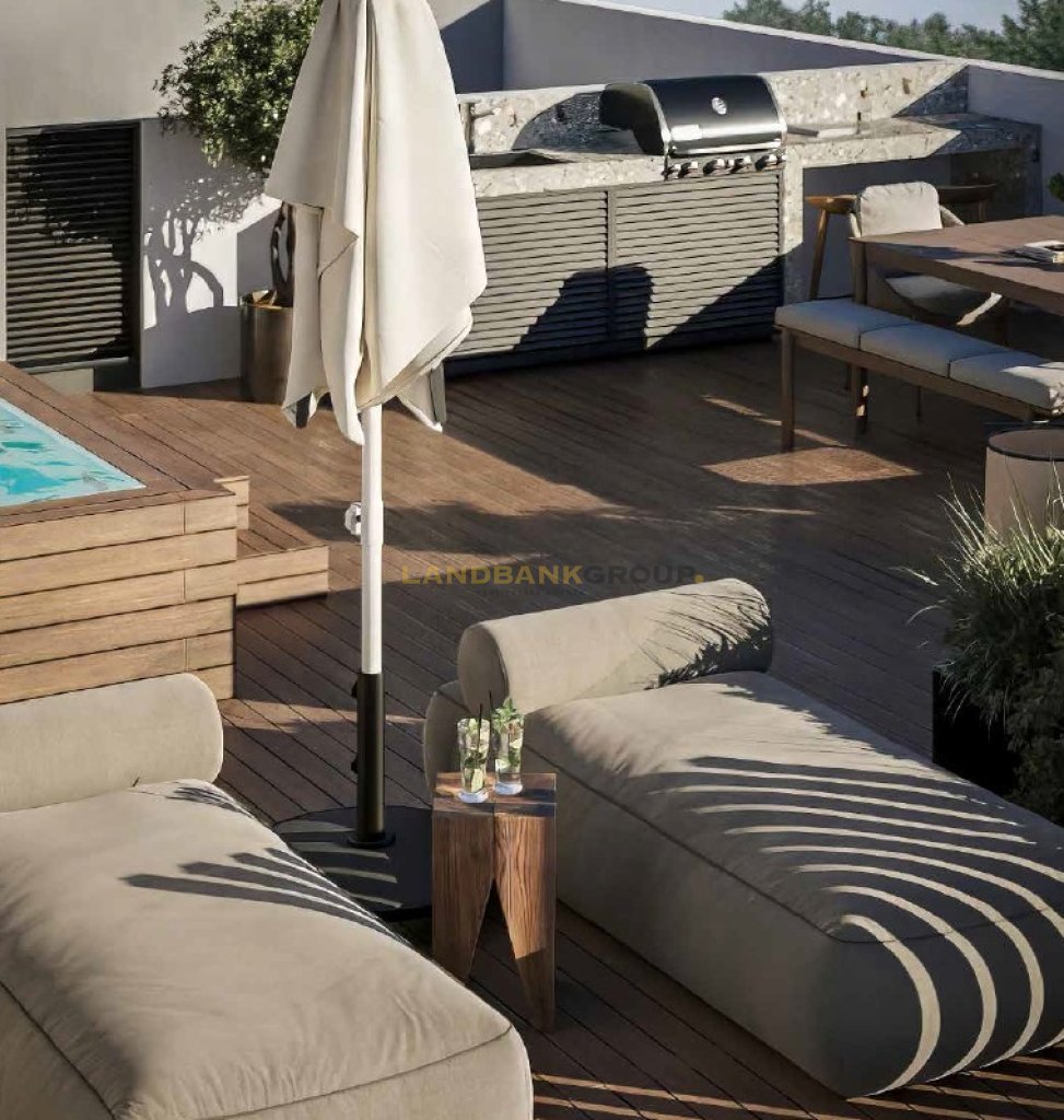 It measures of 80sqm internal area, 22sqm covered verandas and 55sqm roof garden.