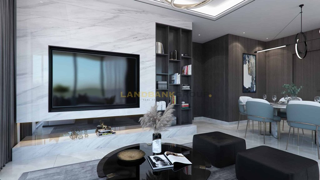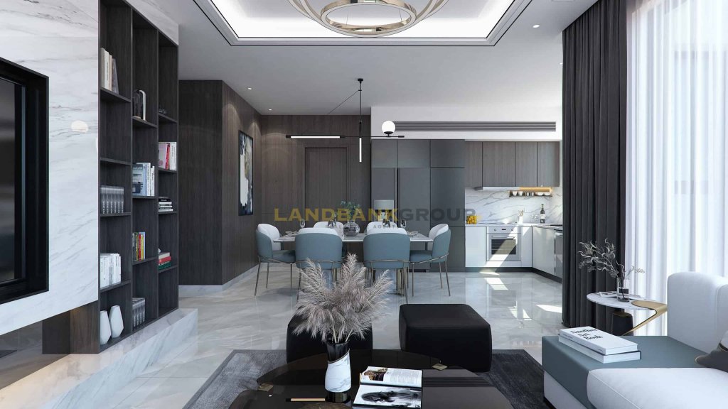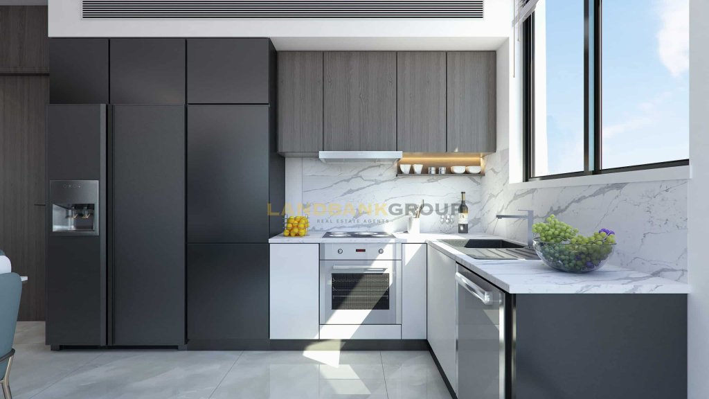 The apartment consists of an open plan kitchen and living/dining area, 2+1(roof) bedrooms, 3 bathrooms, covered veranda, a storage space and a covered parking space.