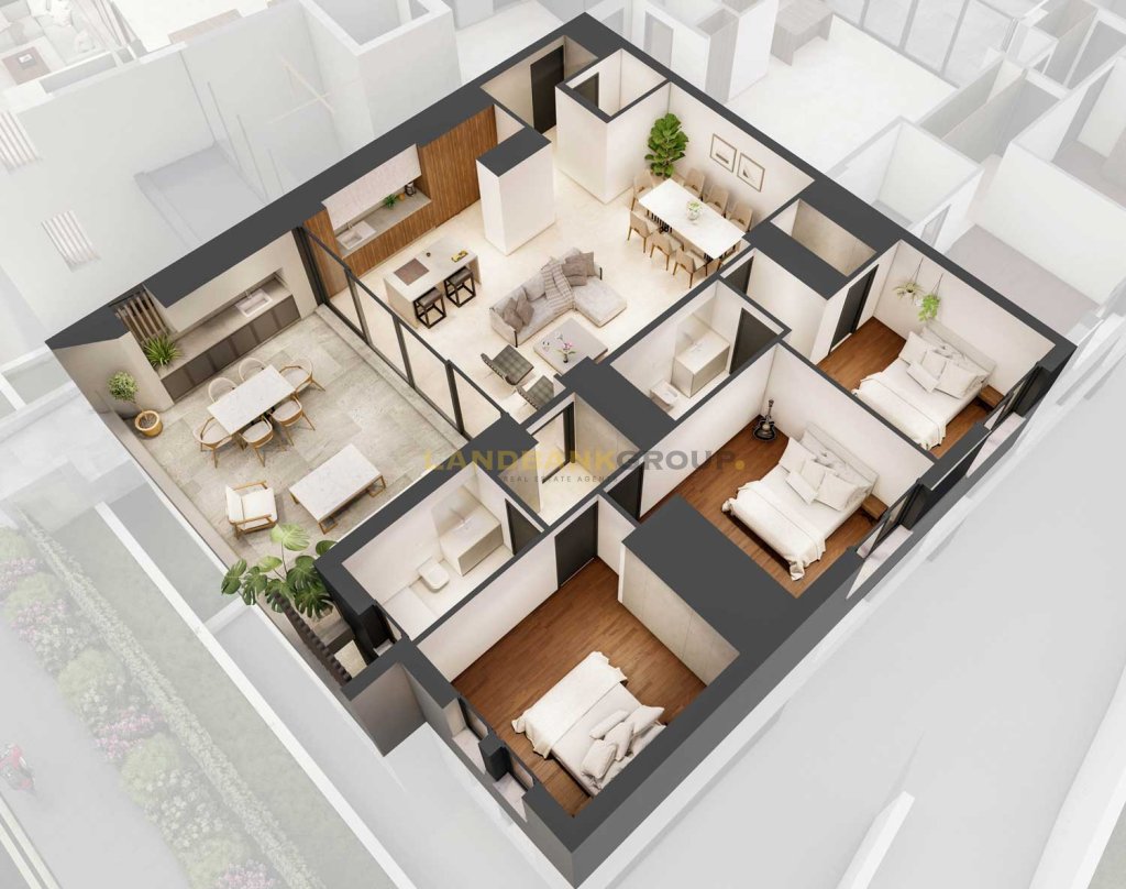 The apartment consists of an open plan kitchen with dining/living room, 3 bedrooms, 2 bathrooms, storage room and 3 covered parking spaces.