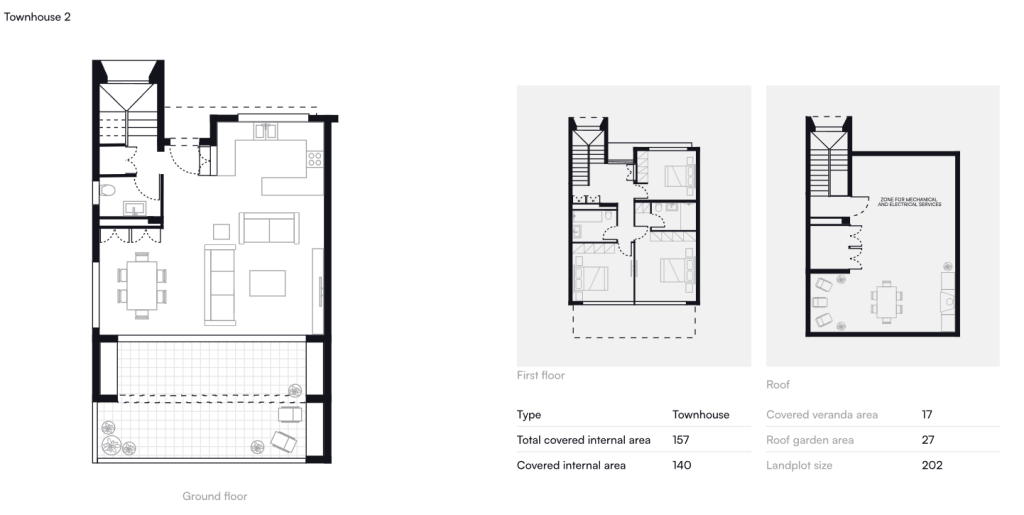 The maisonette has open-plan kitchen-living/dining area, a guests W.C., covered and un-covered veranda, garden area, two outdoor parking spaces on the ground floor. On the 1st floor there are three bedrooms, two bathrooms, laundry area and a staircase leading to the private roof garden offering stunning sea & mountain views.