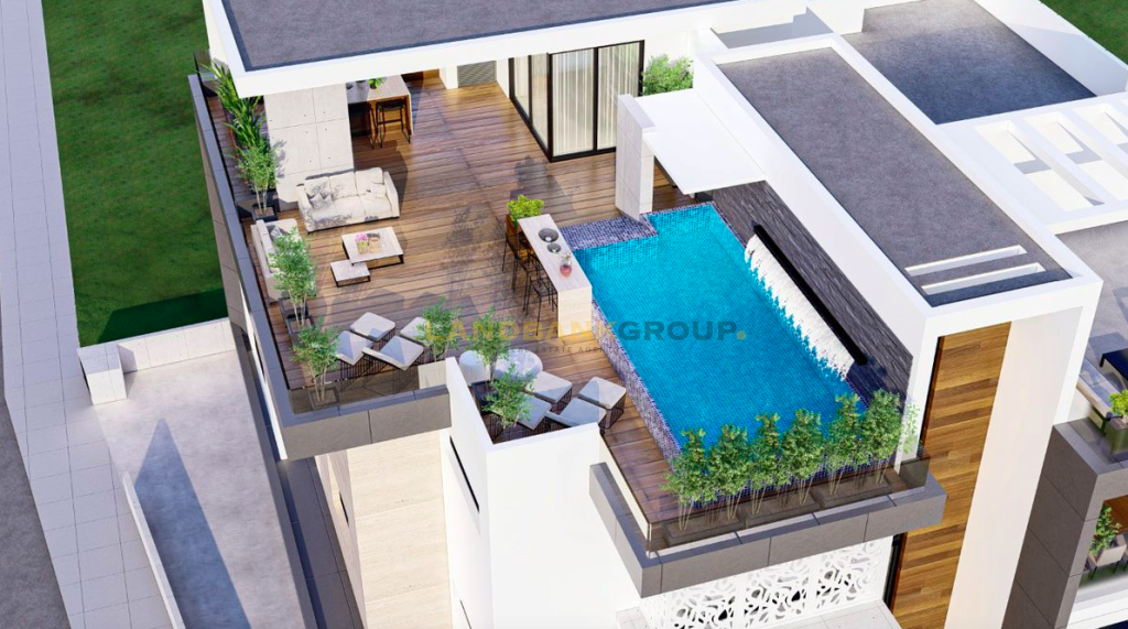 The apartment measures 233sqm internal area with a covered balcony of 15sqm and a roof garden measuring 130sqm.