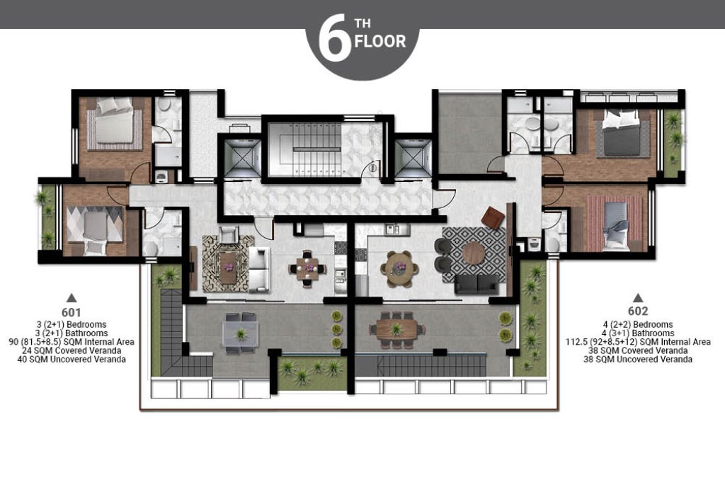 The apartment consist of an open plan kitchen with dining/living room, 4 bedrooms, 3 en-suite bathrooms and a guest toilet.