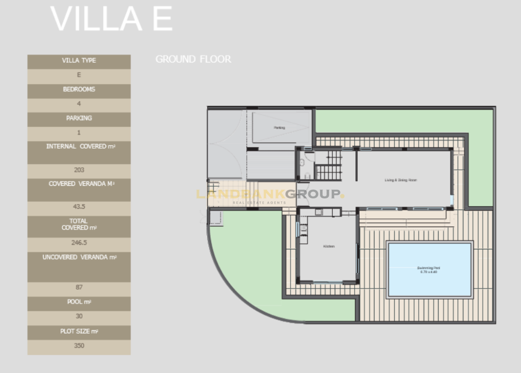 The villa consists of a kitchen, dining/living room, 4 bedrooms, 3 bathrooms, a storage space and a covered parking space.