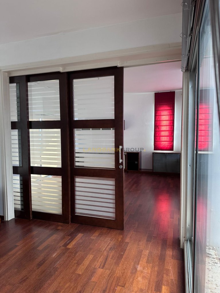 The upper floor includes five spacious rooms, a master suite with en-suite bathroom, walk-in closet and dressing room, plus an additional library. The house provides three kitchens: a main open-plan kitchen with family sitting area, a utility kitchen with laundry, and a smaller service kitchen upstairs.