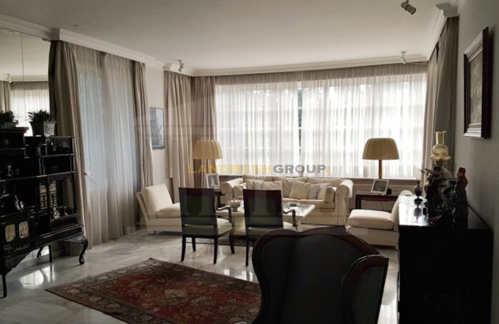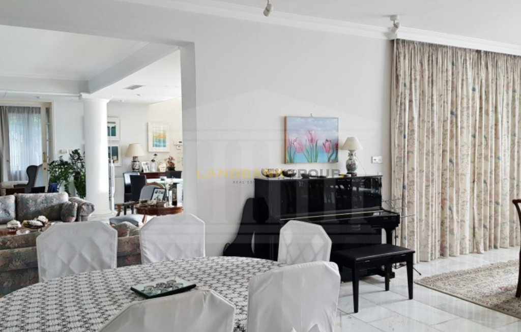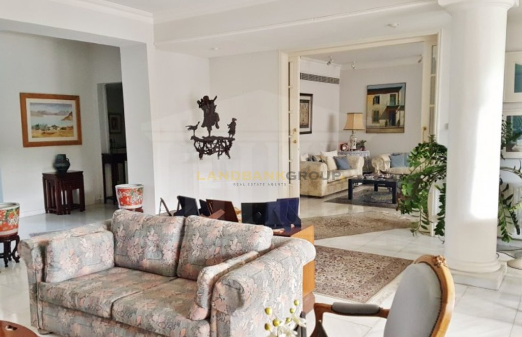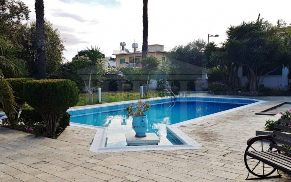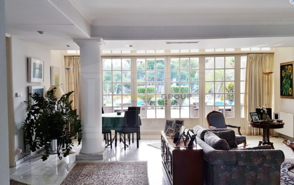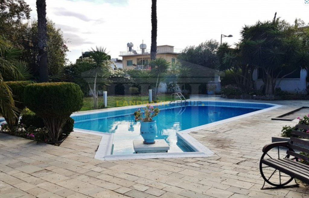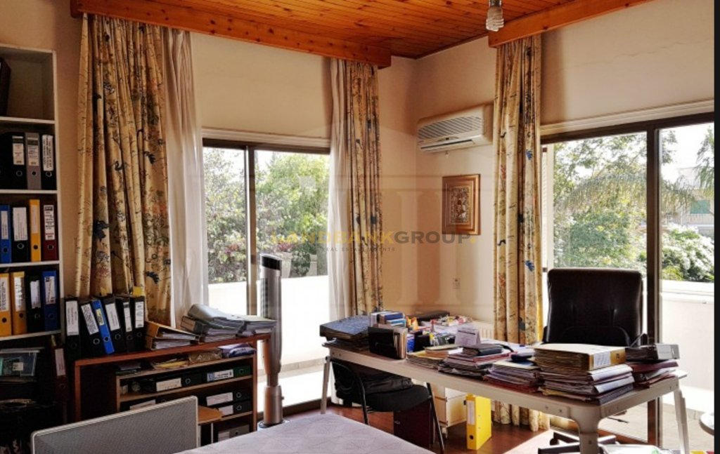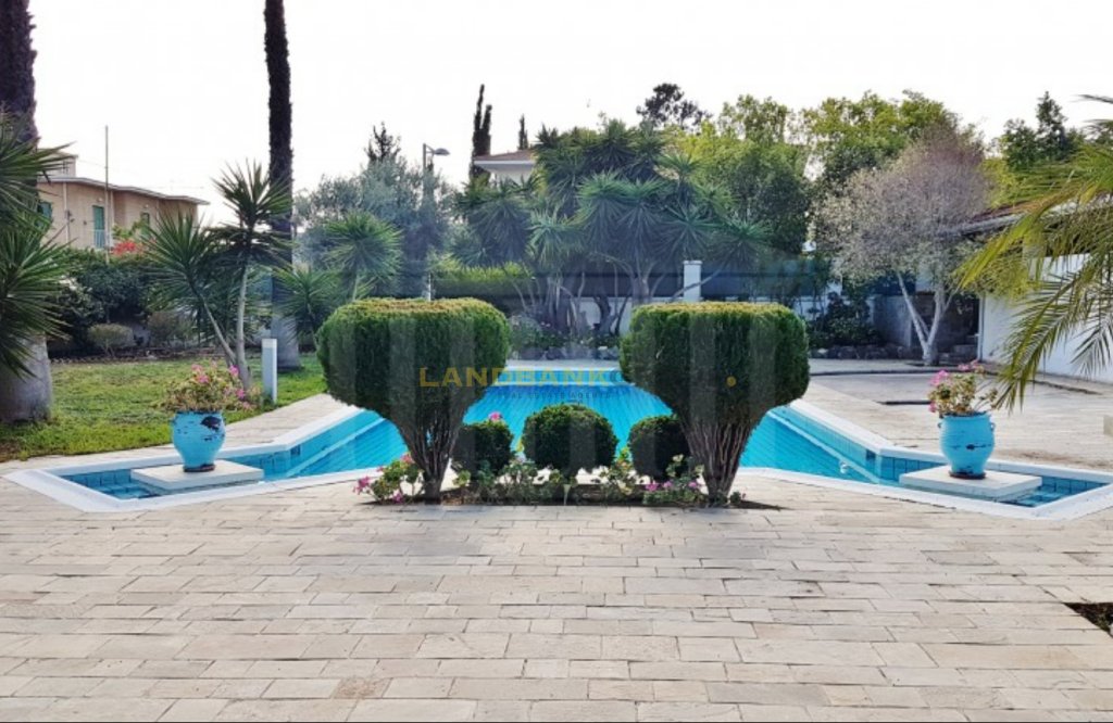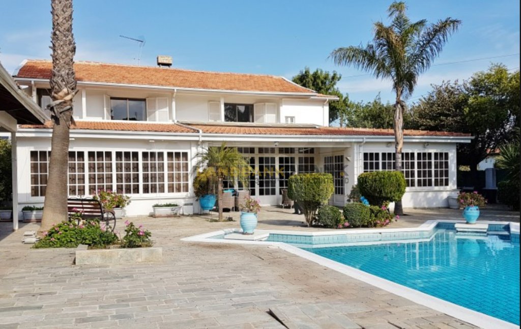 Located in the prestigious neighborhood of Agios Andreas, just 500 meters from Nicosia city center, this aristocratic detached villa offers timeless elegance, privacy, and charm. Set on a generous 1,386 sqm plot, the property features a beautifully maintained mature garden and a large private swimming pool, creating a serene and inviting outdoor environment.Originally constructed in 1967 and thoughtfully renovated over the years—including significant updates in 1980 and recent enhancements such as photovoltaic installation, swimming pool upgrades, and new windows—the home spans approximately 427 sqm of internal space, plus additional covered and uncovered verandas. The villa is uniquely divided into two main sections, seamlessly connected by a central corridor. One side houses the formal living areas, including a spacious sitting room with two classic marble fireplaces, a lounge/TV room, and an elegant dining area with views over the garden and pool. The other section includes a separate fully equipped kitchen, a secondary kitchenette with a laundry area, a guest bathroom, and a dedicated office room.