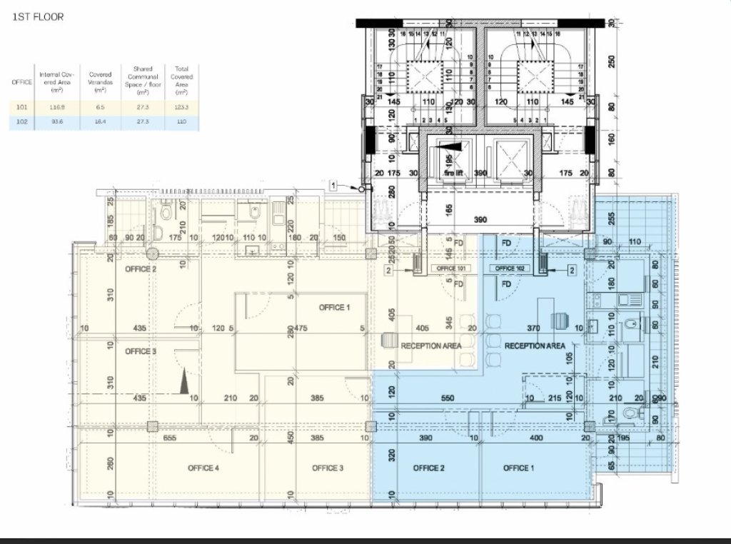Luxury offices situated on a prime commercial avenue in Agios Nikolaos, at the entrance of Larnaca. The property occupies a strategic position at the crossroads between Larnaca city centre and the main highway network connecting Larnaca to the other major cities of Cyprus.The office comprises 94sq.m. of internal area, complemented by a 7 sq.m. covered veranda. Features include provisions for air conditioning and heating, covered parking, and an alarm system.