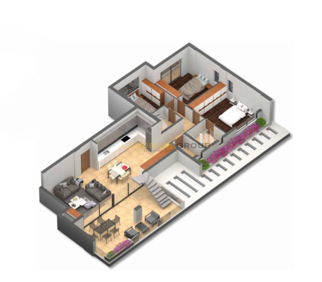 The apartment features 3 bedrooms(one en-suite), 3 bathrooms, open plan kitchen/living room, 2 parking places and a storage room.